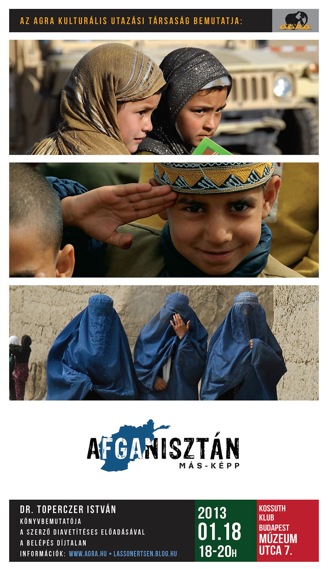 Dr. Toperczer István régi segítője az Agrának, minőségi fotói szerepelnek katalógusunkban, rendezvényeinken, kiadványainkban. Délkelet-Ázsiai témájú fényképalbuma után most afgán élményeiről is igényes könyv született a Zrínyi Kiadó gondozásában. Ennek apropóján rendezzük meg összejövetelünket a budapesti Kossuth Klub nagytermében (Múzeum u. 7.), január 18-án este hat órától. A könyvbemutatón a szerző diavetítéses előadása segít körbetekinteni Afganisztán elrejtett vidékein, mindenkit szeretettel várunk, a belépés díjtalan.