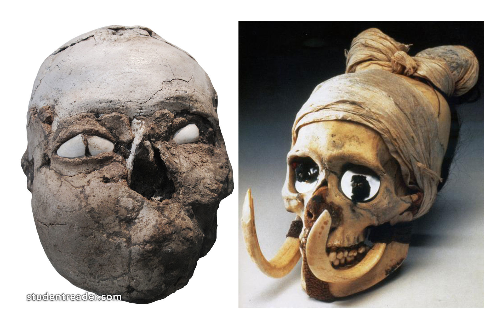Az ősök tisztelete – túlvilági élet. Preparált koponyák Jerikóból (kb. i.e. 8600) és a Marquesas szigetekről (etnográfiai példa). [kép forrása; kép forrása]